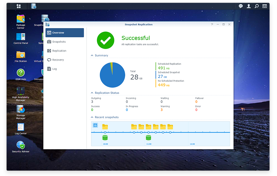 先進的 Btrfs 文件系統(tǒng)于特定 NAS 機種上支持新的快照技術(shù)。Snapshot Replication 讓你可頻繁地將數(shù)據(jù)從主要備份地點復(fù)寫到異地存儲空間 - 最多可以每 5 分鐘備份共享文件夾,每 15 分鐘備份 LUN,確保你存儲在共享文件夾的重要機密或 iSCSI LUN 中的虛擬機能從災(zāi)難事件中快速地復(fù)原。