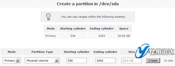 在這里,我們要創(chuàng)建一個新的分區(qū)。首先在“Create a partition in /dev/sda”處設(shè)置“Partition Type”屬性的值為“Physical volume”,在“Ending cylinder”屬性處選擇默認(rèn)值,從而設(shè)置當(dāng)前所有的剩余空間劃為一個分區(qū),最后點(diǎn)擊“Create”選項(xiàng)。如圖