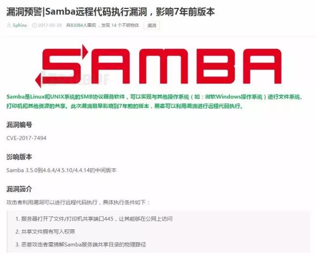 【群暉快報】2017年5月24日Samba發(fā)布了4.6.4版本,修復(fù)了一個嚴(yán)重的遠(yuǎn)程代碼執(zhí)行漏洞,漏洞編號CVE-2017-7494。該安全漏洞可以讓一個有權(quán)限的用戶提權(quán)至Samba所在服務(wù)器的root權(quán)限,進(jìn)而執(zhí)行惡意程序,向該服務(wù)器發(fā)動攻擊。